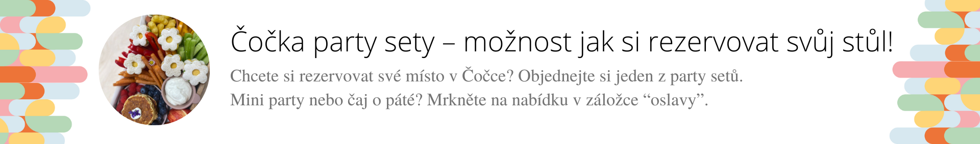 Představujeme vám způsob, jak je možné rezervovat si svůj stůl v Čočce. Set Čočka mini party je nutno objednat alespoň 48 hod. předem, set Čočka na pátou alespoň 24 hod. předem. Je nutná platba předem přes platební bránu nebo rychlým převodem. Do poznámky u objednávky napište, prosím, požadované datum a čas servírování, které je možné po–pa mezi 9:00 a 20:00. Lze rezervovat maximálně dva party sety na jeden čas.
